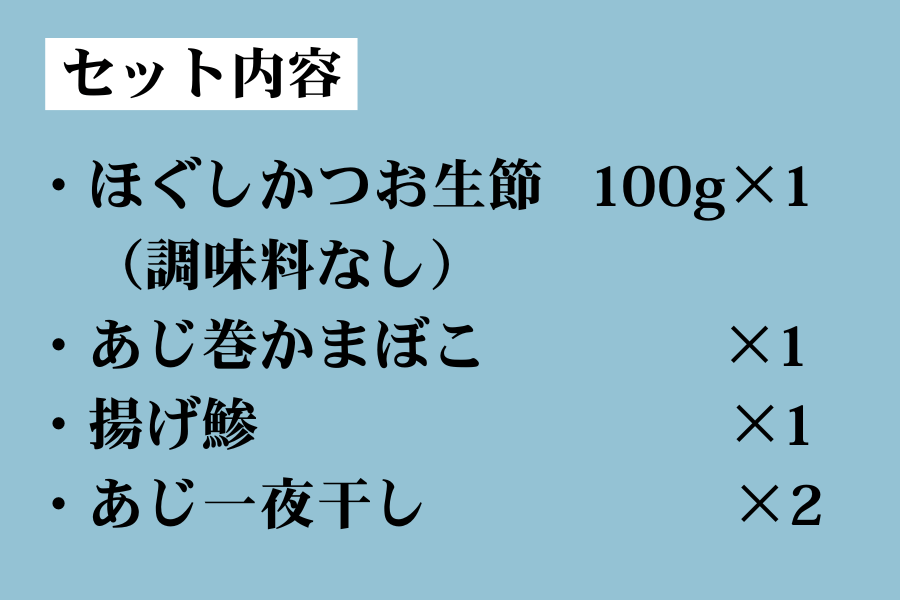 かつお生節、無添加かまぼこ、鯵一夜干しの詰め合わせです。ご贈答品にも最適です!
