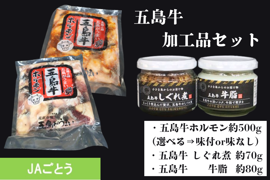 五島牛ホルモン・五島牛しぐれ煮・五島牛牛脂の三品が入った五島牛加工品セットです。食べ方はいろいろ!料理の一品にお試しあれ!