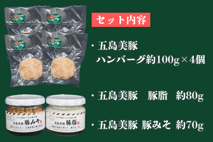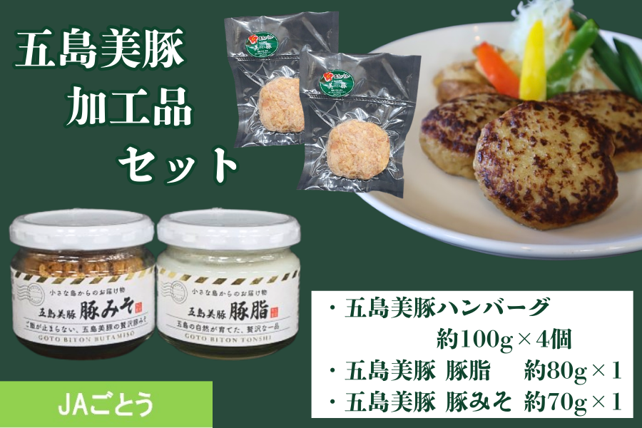 SPF五島美豚を使用したハンバーグと瓶詰め加工品をセットにした商品です。ご飯のおかずに一品いかがでしょうか。