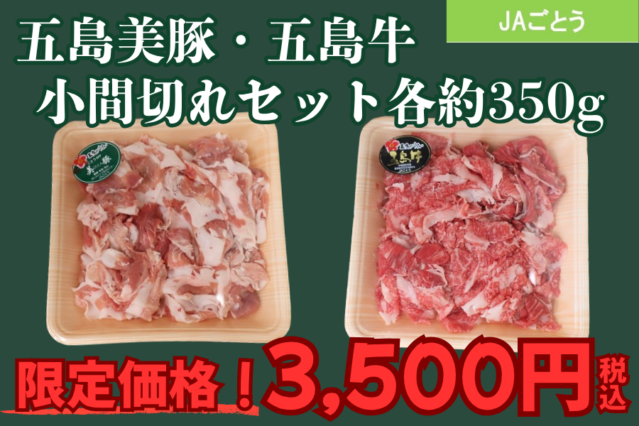 島内で潮風をあびた牧草と農家の愛情で育てられた長崎和牛「五島牛」と、五島列島で厳格な管理体制のもとで育てられたSPF豚「五島美豚」の小間切れセットです。