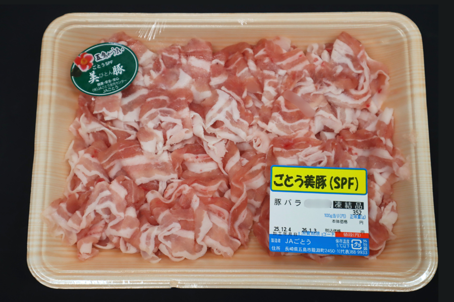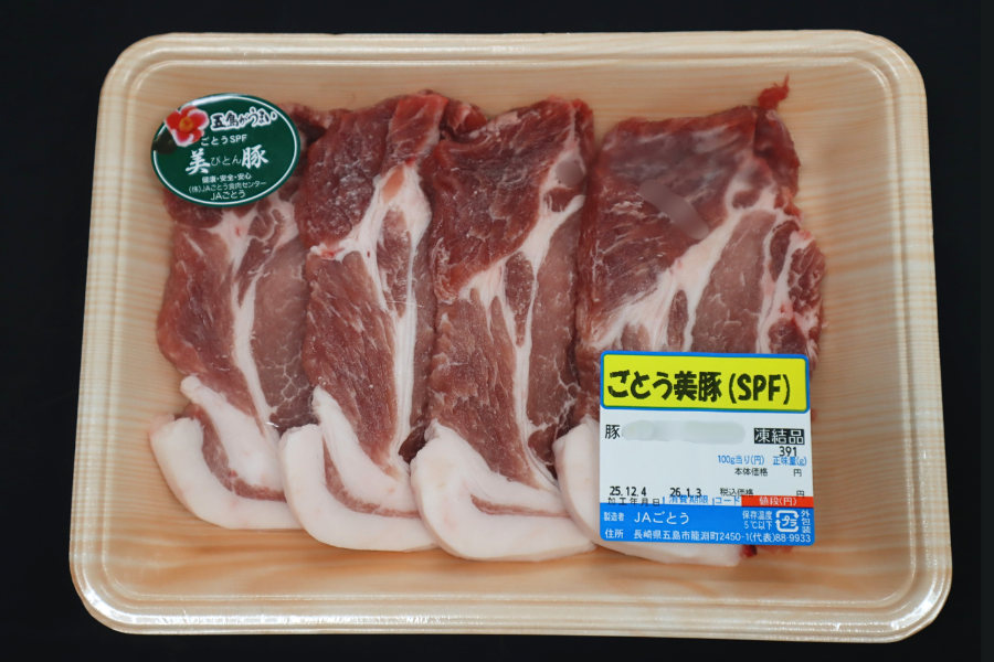 五島美豚は、やわらかく濃いうまみの赤身、さらりとして口どけが良く甘みのある脂身が特長です。