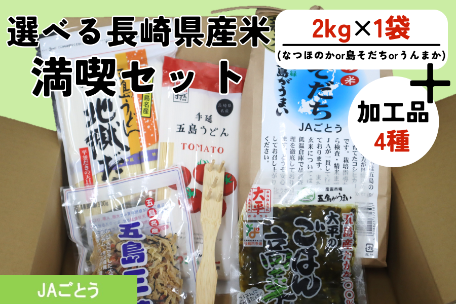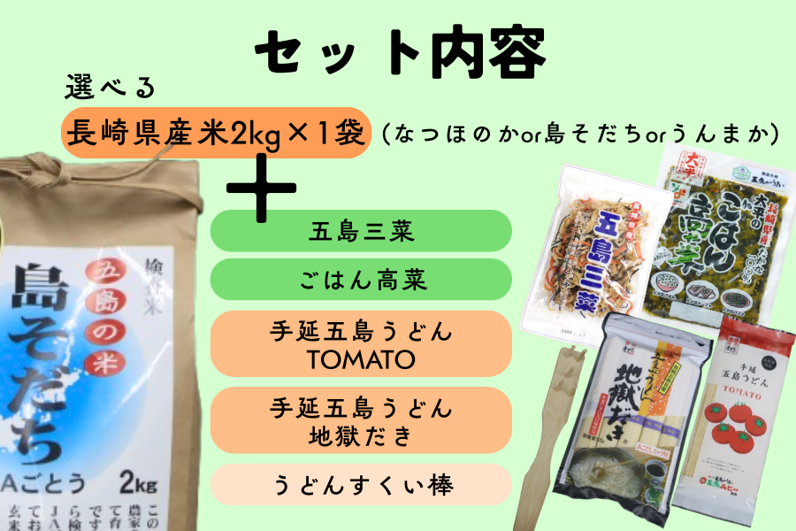 選べる長崎県産米2kgと五島うどん2種、ごはん高菜、五島三菜のセットです!