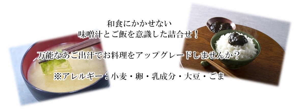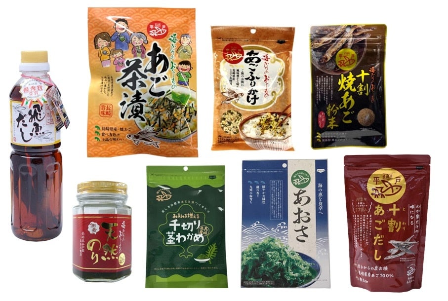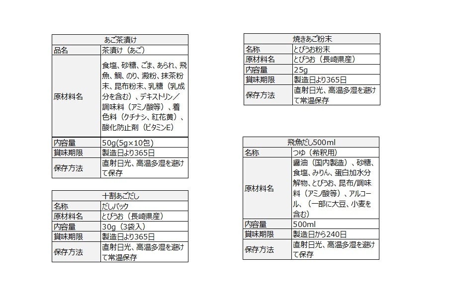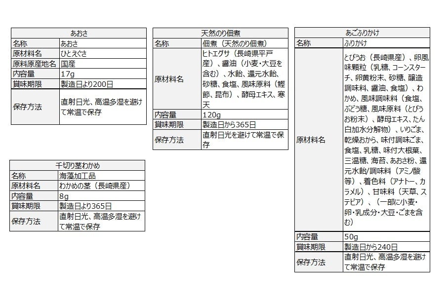 あおさ名称 海藻加工品原材料名 ひとえぐさ(国産)内容量 17g 賞味期限 製造日より200日保存方法 直射日光、高温多湿を避けて保存してください千切り茎わかめ名称 海藻加工品原材料名 わかめの茎(長崎県産)内容量 8g賞味期限 製造日より365日保存方法 直射日光、高温多湿を避け常温保存飛魚だし500ml名称 つゆ(希釈用)原材料名 醤油(国内醸造)、砂糖、食塩、みりん、蛋白加水分解物、とびうお、昆布/調味料(アミノ酸等)、アルコール、(一部に小麦・大豆を含む)内容量 500ml賞味期限 製造日より240日保存方法 直射日光、高温多湿を避けて保存してくださいあごふりかけ名称 ふりかけ原材料名 とびうお(長崎県産)、卵風味顆粒(乳糖、コーンスターチ、卵黄粉末、砂糖、醸造調味料、醤油、食塩)、わかめ、風味調味料(食塩、ぶどう糖、風味原料(とびうお粉末)、酵母エキス、たん白か水分解物)、いりごま、乾燥おから、味付調味ごま、食塩、乳糖、味付大根葉、三温糖、海苔、あおさ粉、還元水飴/調味料(アミノ酸等)、着色料(アナトー、カラメル)、甘味料(天草、ステビア)、(一部に小麦・卵・乳成分・大豆・ごまを含む)内容量 50g賞味期限 製造日より240日保存方法 直射日光、高温多湿を避け常温保存天然のり名称 佃煮(天然のり佃煮)原材料名 ヒトエグサ(長崎県平戸産)、醤油(小麦・大豆含む)、水飴、還元水飴、砂糖、食塩、風味原料(鰹節、昆布)、酵母エキス、寒天内容量 120g賞味期限 製造日より365日保存方法 直射日光、高温多湿を避け常温保存あご茶漬け名称 茶漬け(あご)原材料名 食塩、砂糖、ごま、あられ、飛魚、鯛、のり、澱粉、抹茶粉末、昆布粉末、乳糖(乳成分含む)、デキストリン/調味料(アミノ酸等)、着色料(クチナシ、紅花黄)、酸化防止剤(ビタミンE)内容量 50g(5g×10) 賞味期限 製造日より365日保存方法 直射日光、高温多湿を避けて保存してください
