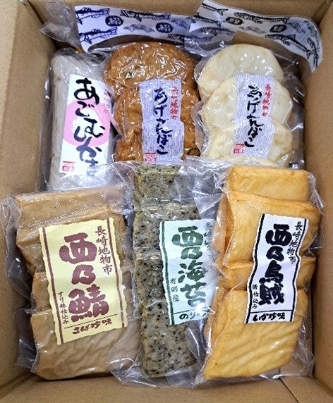 〇商品内容:揚げ蒲鉾えそ4枚・揚げ蒲鉾いわし4枚・あごむしかま1本・西乃烏賊4枚・西乃海苔4枚・西乃鯖4枚