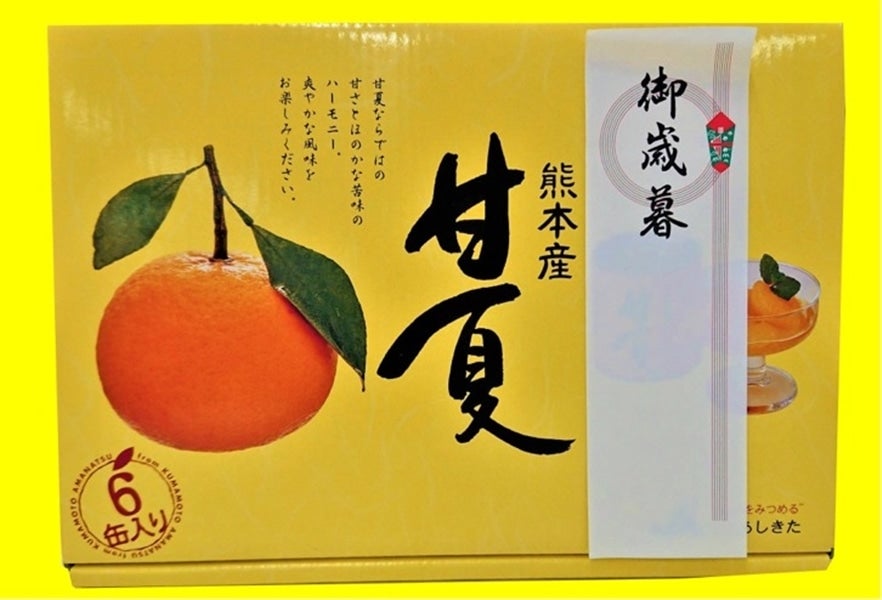穫れたての甘夏の新鮮さをそのまま閉じ込めた缶詰。 甘夏ならではの甘さと苦味のハーモニー!! 心地よい歯応えと爽やかな風味をお楽しみ下さい。 ご贈答にもうってつけの一品です。 ―甘夏缶詰− 名称:夏みかん・シラップ漬け(ヘビー) 形状:全果粒 粒の大きさ:混合 原材料名:夏みかん(熊本県産)、砂糖・ぶどう糖果糖液糖、ハチミツ/酸味料 固形量:160g 内容総量:295g 賞味期限:製造日より3年 使用上の注意:かんをあけると空気にふれて内面が酸化しますので、必ずガラスなどの容器に移しかえてください。 栄養成分表示(100g当たり) エネルギー 80kcal たんぱく質 0.5g 脂質 0.0g 炭水化物 19.7g 食塩相当量 0.01g (推定値) この商品はお歳暮のし付き商品です。