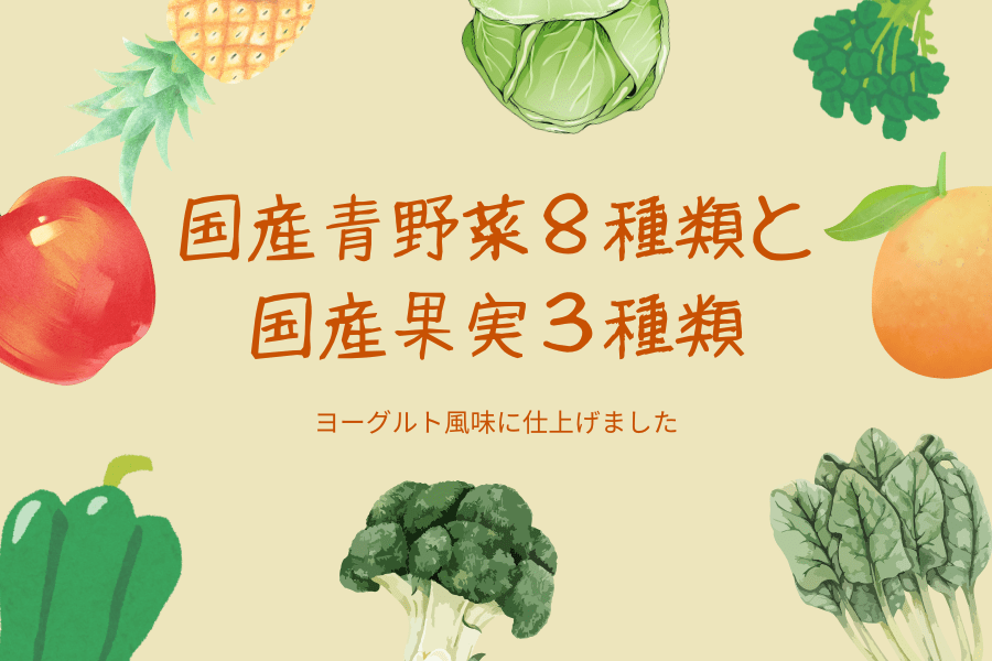 ほうれん草を中心とした国産青野菜8種類と国産果実3種類に、 殺菌乳酸菌飲料をブレンドしたヨーグルト風味の飲料です。