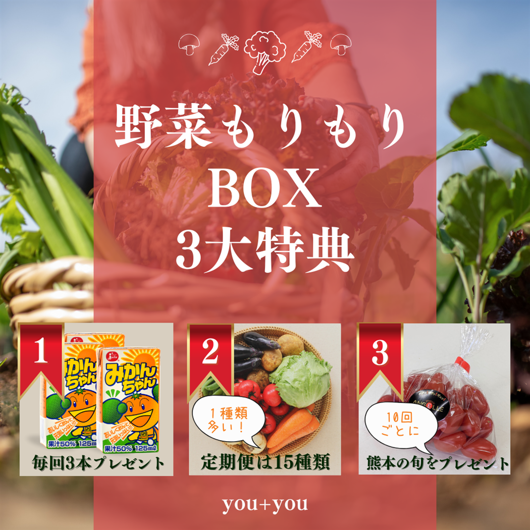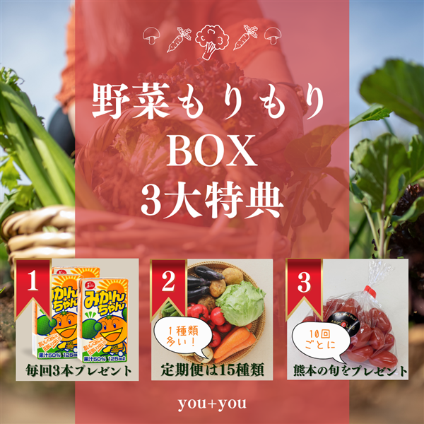 くまもとの新鮮野菜を詰め合せて,定期的にお届けします。くまもとの野菜は「うまかば〜い!」紙パックジュース3本プレゼント付き!&購入10回毎に旬の味覚プレゼント!