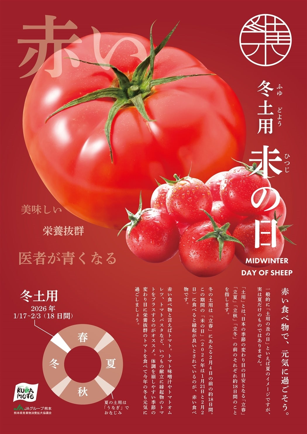 冬の土用は「立春」にあたる2月3日の前の約18日間。 この期間の「未の日」に食べると縁起が良いとされているのが赤い食べ物です。 赤い食べ物と言えばトマト。 トマト味噌汁やトマトオムレツ、トマトパスタなど、いつもの献立に縁起物のトマトをプラスするのがオススメ。 体調を崩しやすい季節の変わり目に栄養抜群のトマトを食べて今年の冬も元気に過ごしましょう!