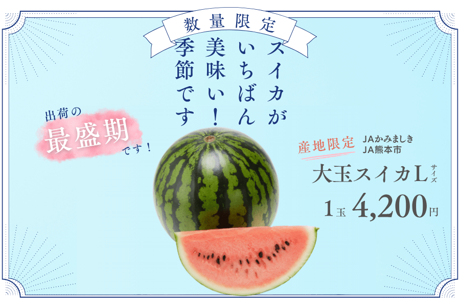 日本一の生産量を誇る熊本スイカ!!爽やかな甘さとシャリッとした食感が特徴!!