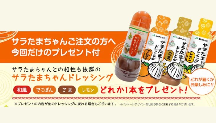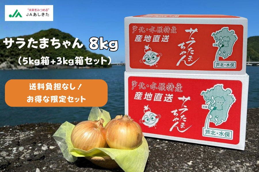 ★春のJAタウン祭り 特別限定商品★ お客様の送料負担なし!! 3kg箱と5kg箱の合計8kgのセット商品です。 期間限定・数量限定でのお得な商品です。 人気の「サラたまちゃんドレッシング」を1本プレゼント! (ドレッシングは4種類の中からランダムで1本をお付けします。) ●サラたまちゃんとは??? JAあしきたブランドの「サラたまちゃん」は、化学農薬・化学肥料の使用をできる限り抑えて栽培し、 みずみずしさ、やわらかさが特徴の新タマネギです。 ご注文が大変込み合うため、お早めにご注文ください!! ★★サラたまちゃんドレッシング 1本プレゼント中★★ [和風][デコポン][レモン][ごま]のいずれかの味をランダムで1本をお届けします。 【おいしい食べ方】 サラたまちゃんをスライスして15分ほど空気にさらすと栄養価が高まり、さらに甘味が増します!! 【商品概要】 商品名:切り玉サラたまちゃん 原産地:熊本県 内容量:合計8kg(LA-M混合 30-45玉前後) 発送期間:5月中 保存方法:青果のなかでも特にデリケートな商品です。 到着後は風通しの良い涼しい場所で保管し、なるべく早めにお召し上がりください。 ※若干の辛みがある場合がございます。 ※LA-M混合ですが、多少サイズに不揃いがございます。 ※Mサイズは「こぶし大」の大きさで使い勝手の良いサイズです。 ※予定数量に達し次第、早めに終了する場合がございます。 ※天候に左右されますので日付指定はできません。 ※発育状況により発送が前後します。 ※出荷時期により皮が褐色化しますが変わらぬ美味しさをお召し上がりいただけます。