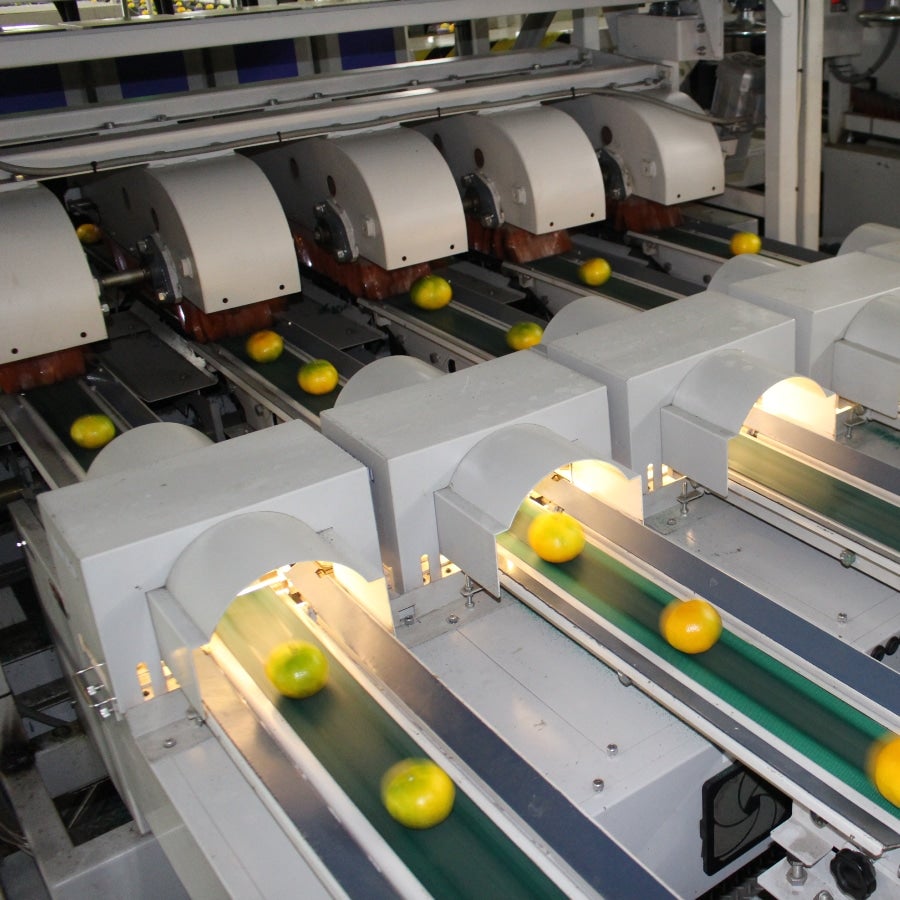 収穫した大きさや味がバラバラな果実は、JAの選果施設で外観(大きさ・キズ等)を区別するのと同時に、糖度・酸度をセンサーで1つ1つ測定し味の区分をします。