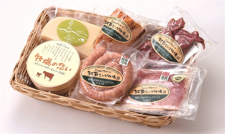 乳製品:あそ野プレーン100g×1 乳製品:牧場の想い(カマンベールタイプ)120g×1 ミート:ぐるぐるソーセージ100g×1 ミート:おつまみベーコン×1 ミート:ボンレスハムスライス80g×1 ミート:赤鶏スモークチキン100g×1 ギフトケース入りです