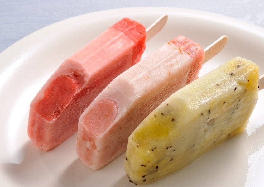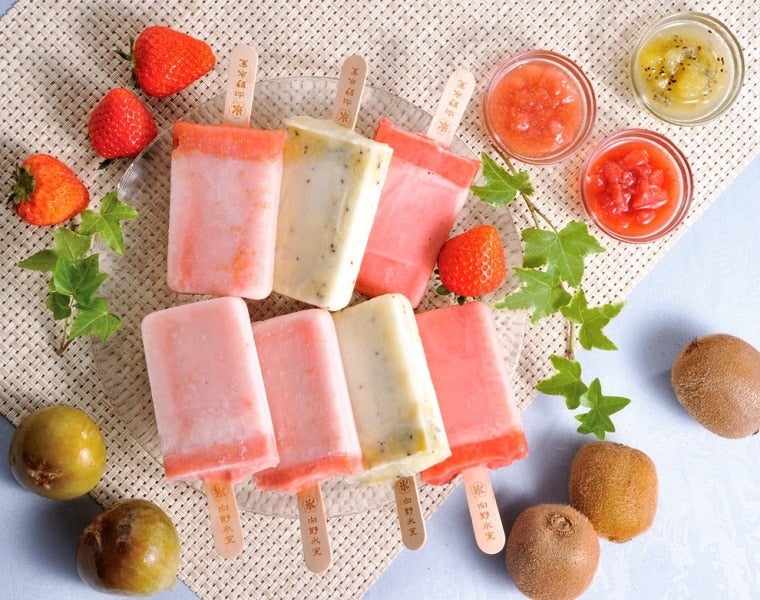 氷アイスの中に『あまおう、キウイ、イチジク』の生ジャムをそれぞれ入れた贅沢フルーツアイスバーです♪