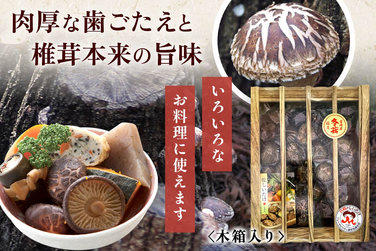 もっと見る・原木椎茸にこだわる宮崎の椎茸。 日照時間が長く気候も温暖な宮崎は椎茸にとって理想的な環境です。 肉厚な歯ごたえと椎茸本来の旨味をぜひ、ご賞味ください。 こちらの商品は木箱に入っております。 〈乾しいたけの効用♪〉 乾しいたけは風味があるばかりでなく、 低カロリー、高ビタミン、高ミネラルで、食物繊維に富み、自然の健康がバランス良く詰まっています。 お子様からお年寄りまで、安心してご利用できる、栄養価の高い健康食品です。 ※賞味期限…製造日より1年以内 ※原材料…原木しいたけ ※保存方法…直射日光を避け、湿度の低い所で保存して下さい。