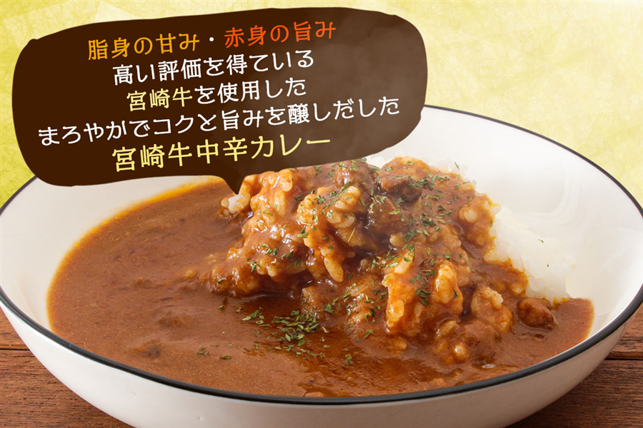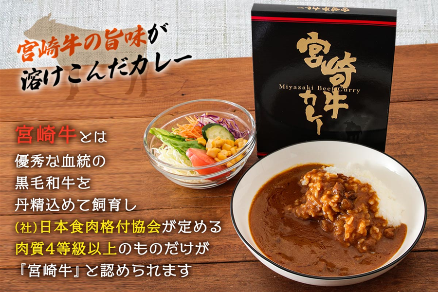 宮崎県産の農畜産物にこだわり開発した宮崎牛カレー ☆宮崎牛カレーを食卓に☆ 温暖な気候と豊かな自然に恵まれた宮崎県で育った宮崎牛(肉質等級4等級以上のもの)を使用したカレーです。 「脂身の甘み」「赤身の旨み」が出ている少し甘めの中辛カレーはいかがですか? ぜひ一度、宮崎こだわりの一品をご賞味ください。 内容量・・・180g×6箱入 原材料・・・野菜・果実(タマネギ、ニンジン、バナナ)、牛肉(宮崎県産)、小麦粉、植物油脂、砂糖、食用油脂(牛脂、豚脂)、ウスターソース、脱脂粉乳、食塩、トマトペースト、おろしにんにく、カレー粉、香辛料、おろししょうが、ソテー・ド・オニオン、オニオンパウダー、乳糖、フォン・ド・ボーソース、ソースパウダー、ぶどう糖/調味料(アミノ酸等)、着色料(カラメル)、乳化剤、酸味料、(一部に小麦・乳成分・牛肉・豚肉・大豆・バナナ・りんごを含む) 賞味期限・・・製造日より1年 保存方法・・・室温で保存