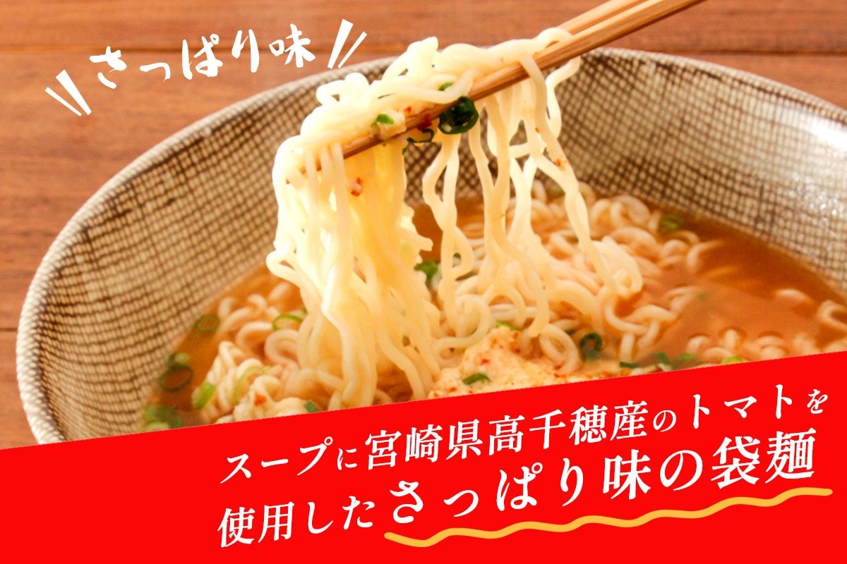 宮崎県高千穂産のトマトを粉末スープに使用した袋麺です。