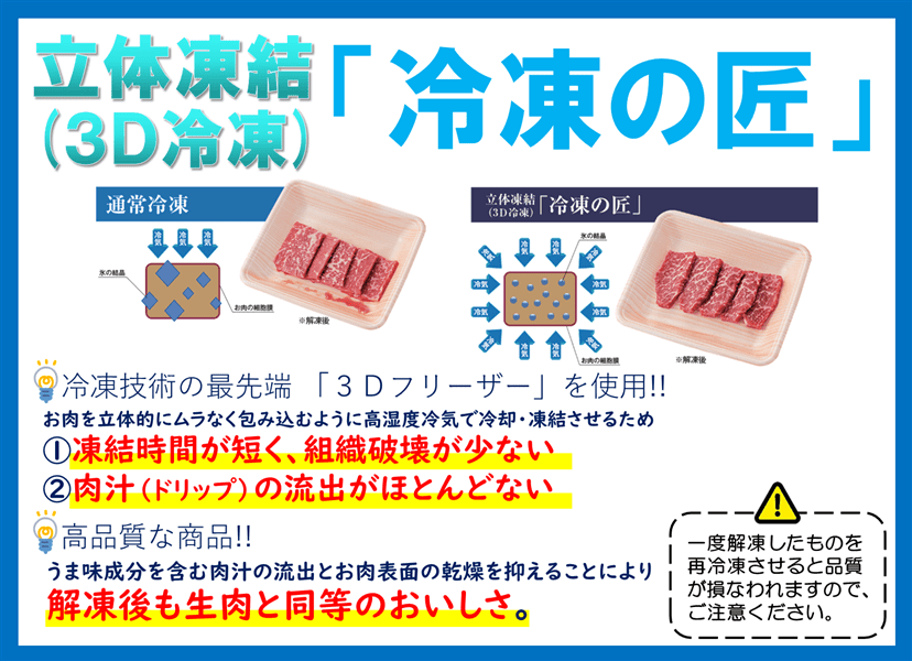 ◆宮崎牛 宮崎で生まれ、宮崎で育った指定された父牛を持つ黒毛和牛で、肉質等級5等級・4等級の牛肉だけが宮崎牛になります。 <宮崎牛 受賞・採用歴> ●全国和牛能力共進会(通称:和牛のオリンピック)  4大会連続「内閣総理大臣賞」受賞(第9回・10回・11回・12回) ●米国アカデミー賞アフターパーティー公式メニュー採用 ●昭和61年から大相撲優勝力士へ進呈(年6場所) ●Jリーグアウォーズ最優秀育成クラブ賞として進呈 ●ダンロップフェニックストーナメント歴代優勝者に進呈 ◆冷凍の匠 3Dフリーザーで立体凍結(3D冷凍)させたお肉は凍らせる前と同等のおいしさ!  通常の冷凍は、お肉が凍るまでに時間がかかるため、お肉の中にできる氷の結晶が大きくなり、細胞膜を傷つけます。そのため解凍時に出る肉汁(ドリップ)が多くなり、食べた時のジューシー感が失われてしまうのです。  一方で、3D冷凍では多方面から3D冷気を当ててお肉を包み込むように急速冷凍するので氷の結晶が小さくなり細胞膜を傷つけることがありません。そのため、解凍時に出る肉汁も少なくなり日本全国どこでも産地で食べる宮崎牛と同じ品質を味わえます。 衛生環境の整った施設にて生産者の想いを胸に感謝の気持ちを持ち続け、5つの食品安全方針 @【顧客満足に努める】 A【食の安全・安心に努める】 B【食品安全システムの構築に努める】 C【地域社会への貢献に努める】 D【環境保全に努める】 をかかげ、お客様へ商品をお届けしています。 ○商品名:冷凍の匠 宮崎牛5種盛り食べ比べ焼肉 ○内容量:宮崎牛モモ100g・ウデ50g・バラ50g・ロース50g・肩ロース50g ○賞味期限:冷凍90日 ○保存方法:冷凍 ○原産地:宮崎県産 ○肉質:宮崎牛(4等級または5等級) ○アレルギー:牛肉 ○発送:化粧箱に入れてお届け