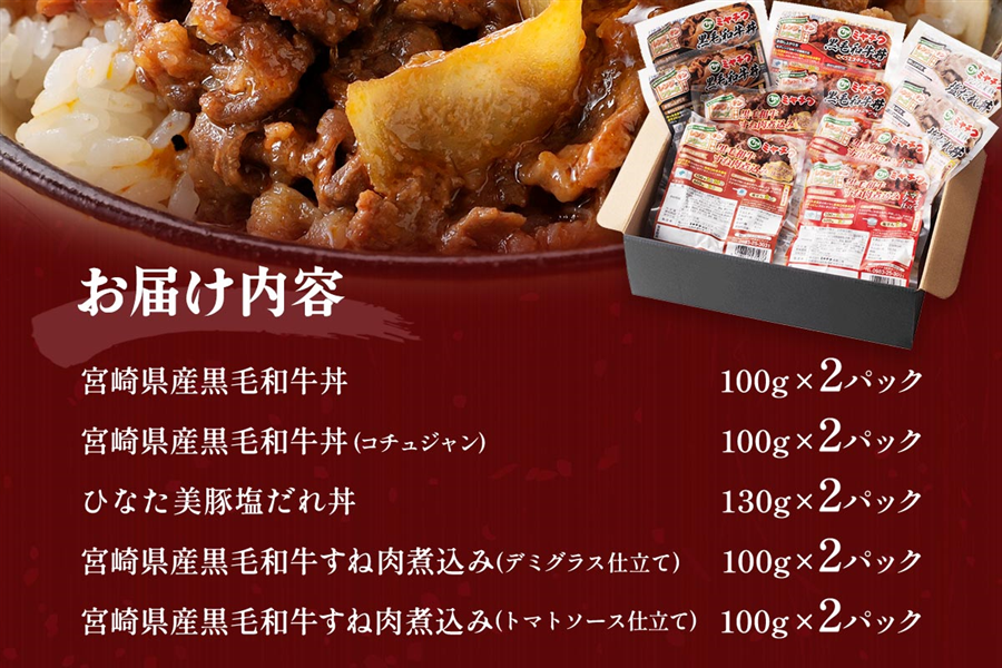 ◆レンジでチンシリーズ ご飯がすすむメニューとして誕生したレンジでチンシリーズ。老若男女がつい笑顔になってしまう味わいに仕上げました。故郷を離れたお子さんへの贈り物や、普段の食卓に手軽に彩りを添えるメニューとして、さまざまなシーンで活躍するシリーズです。 衛生環境の整った施設にて生産者の想いを胸に感謝の気持ちを持ち続け、5つの食品安全方針 @【顧客満足に努める】 A【食の安全・安心に努める】 B【食品安全システムの構築に努める】 C【地域社会への貢献に努める】 D【環境保全に努める】 をかかげ、お客様へ商品をお届けしています。 ○商品名:CN-779 レンジでチン バラエティセット ○内容量:宮崎県産黒毛和牛丼100g×2パック 宮崎県産黒毛和牛丼(コチュジャン)100g×2パック ひなた美豚塩だれ丼130g×2パック 宮崎県産黒毛和牛すね肉煮込み(デミグラス仕立て)100g×2パック 宮崎県産黒毛和牛すね肉煮込み(トマトソース仕立て)100g×2パック ○賞味期限:冷凍90日 ○保存方法:冷凍 ○原産地:宮崎県産 ○アレルギー:牛肉・豚肉・鶏肉・乳成分・小麦・大豆・ごま・えび・りんご ○発送:化粧箱に入れてお届け