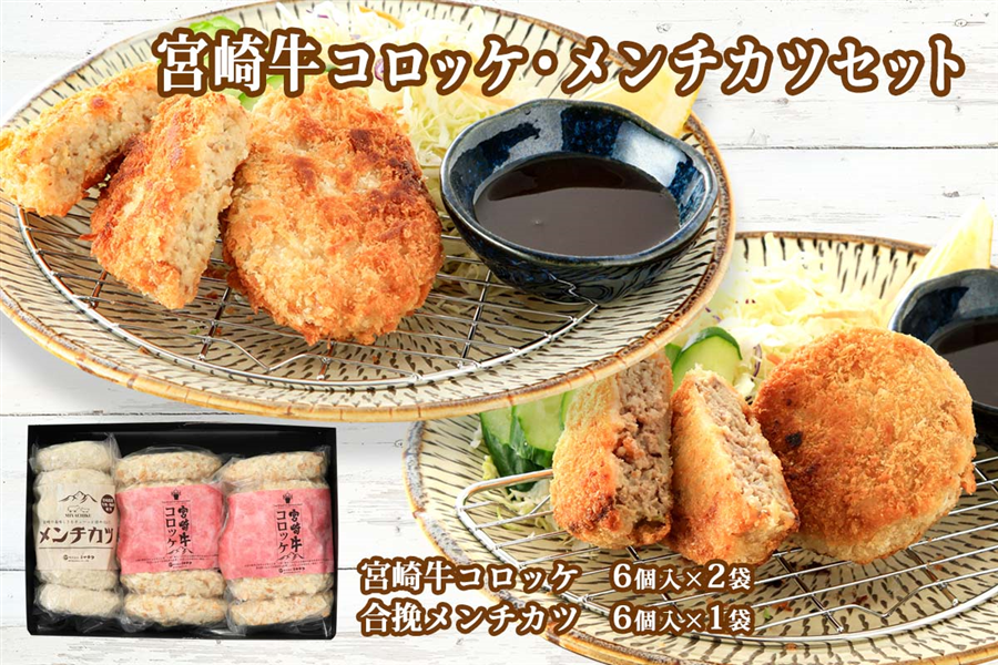 衛生環境の整った施設にて生産者の想いを胸に感謝の気持ちを持ち続け、5つの食品安全方針 @【顧客満足に努める】 A【食の安全・安心に努める】 B【食品安全システムの構築に努める】 C【地域社会への貢献に努める】 D【環境保全に努める】 をかかげ、お客様へ商品をお届けしています。 ○商品名:宮崎牛コロッケとメンチカツセット ○内容量:宮崎牛コロッケ6個入×2袋      合挽メンチカツ6個入×1袋 ○賞味期限:冷凍90日 ○保存方法:冷凍 ○原産地:宮崎県産・国産 ○アレルギー:豚肉・牛肉・卵・乳成分・小麦・大豆・りんご ○発送:化粧箱に入れてお届け