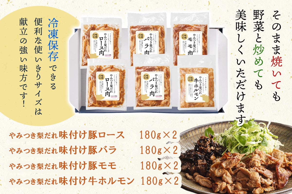 ◆やみつき梨だれ 無添加素材のやみつき梨だれで有名な今釜屋様とのコラボ商品になります。 国産の牛ホルモン・ひなた美豚をやみつき梨だれ(味噌)に漬け込みました。 たれは宮崎県の無添加素材にこだわり、全て手作業で仕上げています。 梨を使用することにより、消化酵素の働きでお肉が柔らかくなり、お子様からお年寄りまで幅広い層にご賞味いただけます。 そのまま焼いても、野菜と炒めても美味しくいただけます。 冷凍保存できる便利な使いきりサイズは、献立の強い味方です! 衛生環境の整った施設にて生産者の想いを胸に感謝の気持ちを持ち続け、5つの食品安全方針 @【顧客満足に努める】 A【食の安全・安心に努める】 B【食品安全システムの構築に努める】 C【地域社会への貢献に努める】 D【環境保全に努める】 をかかげ、お客様へ商品をお届けしています。 ○商品名:やみつき梨だれ味付け肉セット(中) ○内容量:やみつき梨だれ味付け豚ロース180g×2パック やみつき梨だれ味付け豚バラ180g×2パック やみつき梨だれ味付け豚モモ180g×1パック やみつき梨だれ味付け牛ホルモン180g×1パック ○賞味期限:冷凍90日 ○保存方法:冷凍 ○原産地:宮崎県産・国産(ホルモン) ○アレルギー:小麦・牛肉・豚肉・大豆・ごま・キウイ・バナナ ○発送:化粧箱に入れてお届け