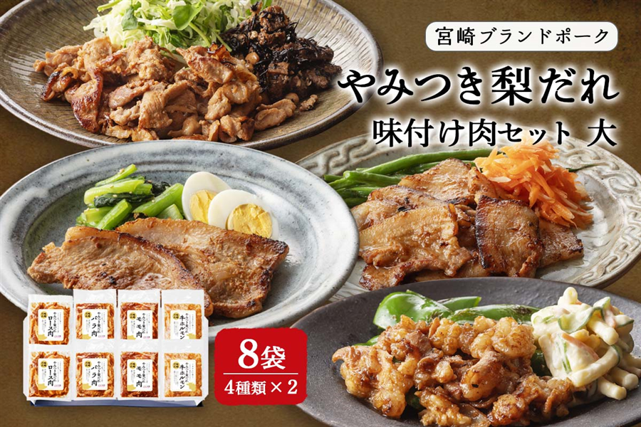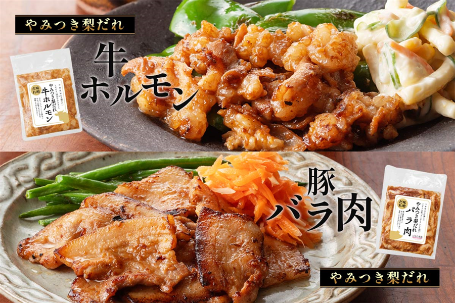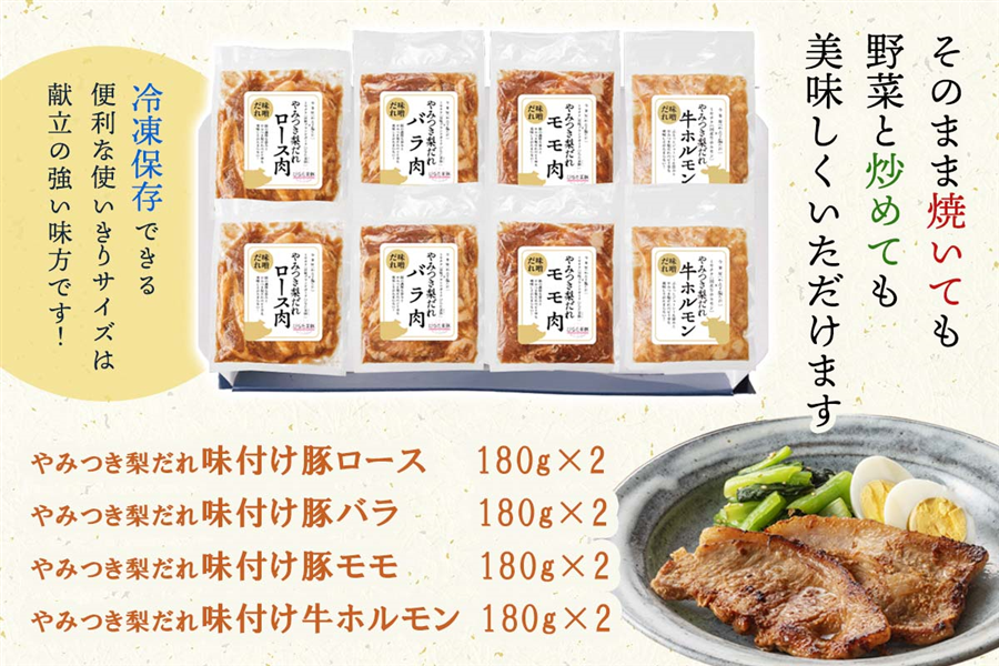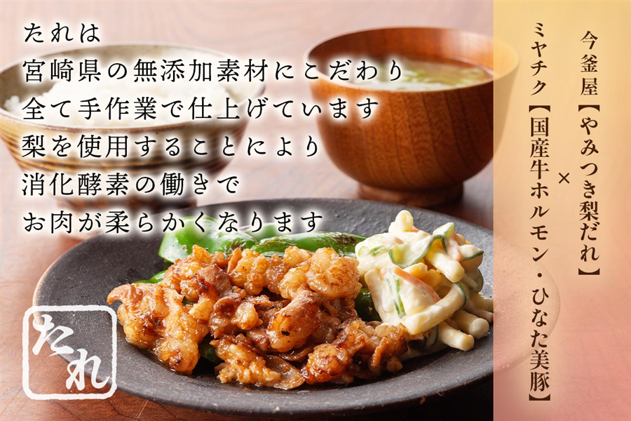 もっと見る◆やみつき梨だれ 無添加素材のやみつき梨だれで有名な今釜屋様とのコラボ商品になります。 国産の牛ホルモン・ひなた美豚をやみつき梨だれ(味噌)に漬け込みました。 たれは宮崎県の無添加素材にこだわり、全て手作業で仕上げています。 梨を使用することにより、消化酵素の働きでお肉が柔らかくなり、お子様からお年寄りまで幅広い層にご賞味いただけます。 そのまま焼いても、野菜と炒めても美味しくいただけます。 冷凍保存できる便利な使いきりサイズは、献立の強い味方です! 衛生環境の整った施設にて生産者の想いを胸に感謝の気持ちを持ち続け、5つの食品安全方針 @【顧客満足に努める】 A【食の安全・安心に努める】 B【食品安全システムの構築に努める】 C【地域社会への貢献に努める】 D【環境保全に努める】 をかかげ、お客様へ商品をお届けしています。 ○商品名:やみつき梨だれ味付け肉セット(大) ○内容量:やみつき梨だれ味付け豚ロース180g×2パック やみつき梨だれ味付け豚バラ180g×2パック やみつき梨だれ味付け豚モモ180g×2パック やみつき梨だれ味付け牛ホルモン180g×2パック ○賞味期限:冷凍90日 ○保存方法:冷凍 ○原産地:宮崎県産・国産(ホルモン) ○アレルギー:小麦・牛肉・豚肉・大豆・ごま・キウイ・バナナ ○発送:化粧箱に入れてお届け