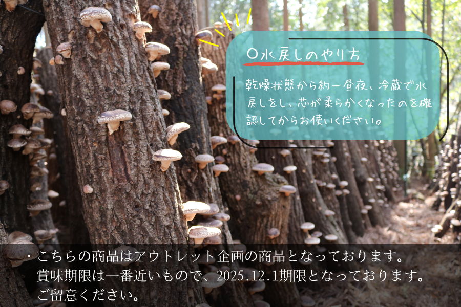 〈乾しいたけの効用♪〉 乾しいたけは風味があるばかりでなく、 低カロリー、高ビタミン、高ミネラルで、食物繊維に富み、自然の健康がバランス良く詰まっています。 お子様からお年寄りまで、安心してご利用できる、栄養価の高い健康食品です。 ※原材料…原木しいたけ ※保存方法…直射日光を避け、湿度の低い所で保存して下さい。