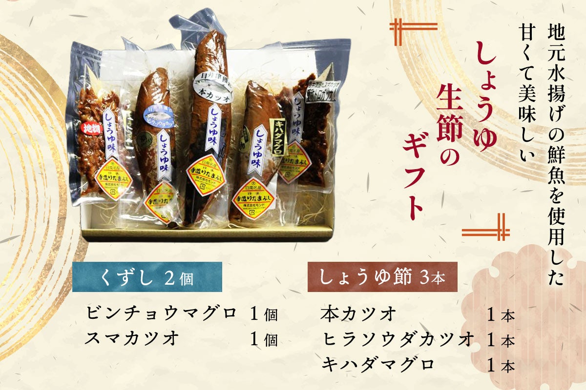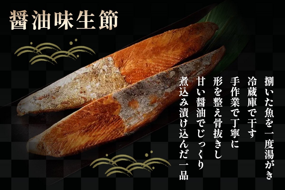 地元で水揚げされた新鮮な魚を使用した、甘くて美味しい「しょうゆ生節」のギフトセット。