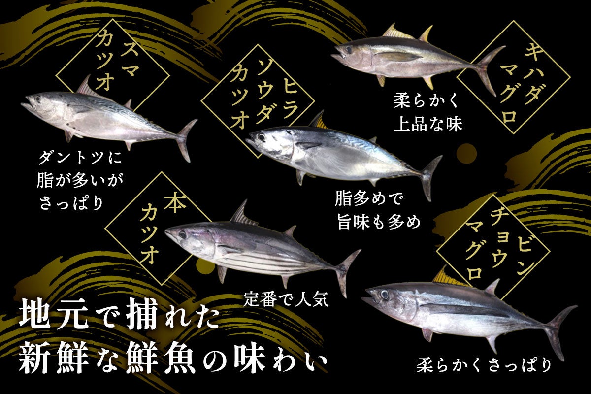 くずし2個(ビンチョウマグロ、スマカツオ)、しょうゆ節3本 (本カツオ、ヒラソウダカツオ、キハダマグロ)