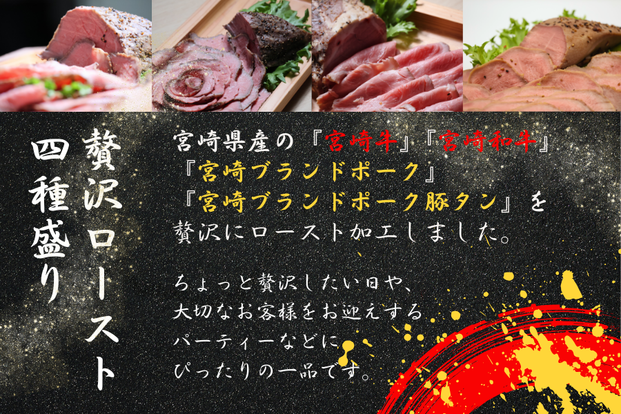 宮崎のブランド肉である「宮崎牛」と「宮崎ブランドポーク」を 贅沢にロースト加工をしました。 ちょっと贅沢したい日や、大切なお客様をお迎えするパーティーなどにぴったりの一品です。 ※個体差により大きさにばらつきが出る場合がございます。 ※冷凍でお送りします。解凍後、そのままお召し上がりください。 内容量 宮崎牛ローストビーフ×1 和牛ローストビーフ×1 宮崎ブランドポークローストポーク×1 宮崎ブランドポーク豚タンローストポーク×1 総重量:1kg