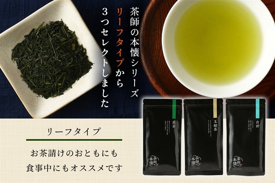 茶師の本懐シリーズのリーフタイプ商品を3つセレクトしました。 この商品はすべて緑茶から出来ていますが、製法によって風味や色味がガラリと変わります。 その違いをどうぞ心ゆくまでお楽しみください。 ■ 商品説明 @ 煎茶(70g) 飲むたびに広がるコク ほのかな渋み 甘みの余韻 日常を少し贅沢に 【このシーンにオススメ】午前10時半 来客時に。団らんと共にお楽しみください。 A 玉緑茶(80g) まろやかな甘みと心地よい香り きっとあなたも私の虜に 【このシーンにオススメ】午前8時 朝食時に。おにぎりと相性ばっちり。 B白折(80g) ときめく甘さ 静かで優しい香りが癒しの空間へ誘う 【このシーンにオススメ】午後15時 おやつの時間に。和菓子と相性ばっちり。