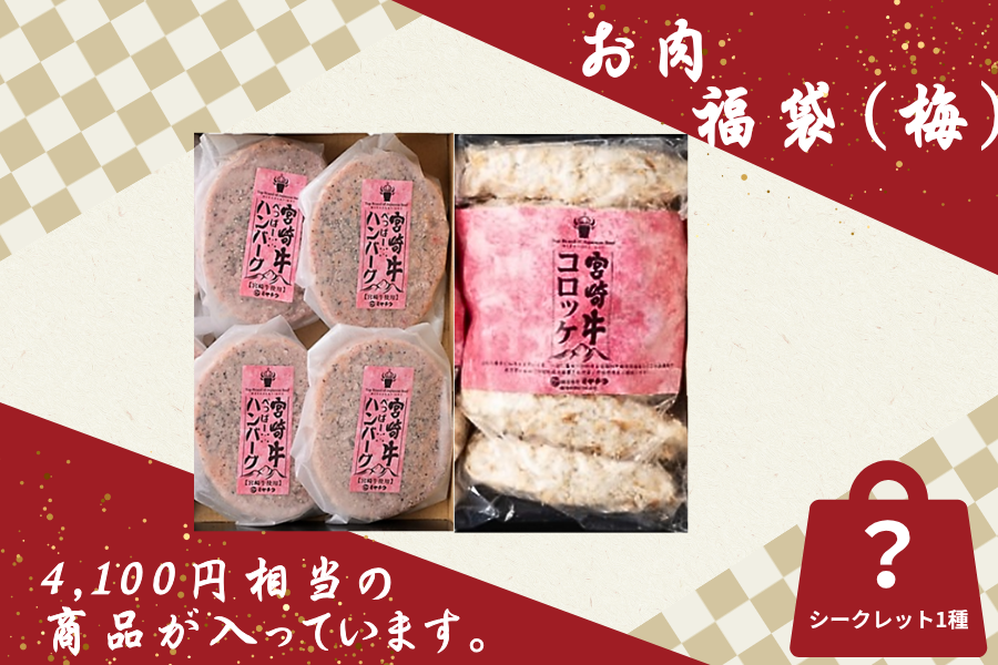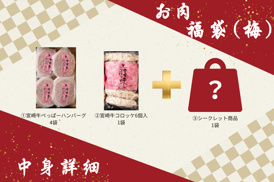 お肉福袋(梅) 中身詳細 @宮崎牛ぺっぱーハンバーグ…4袋 厳選された宮崎牛を100%使用した贅沢なハンバーグ。 宮崎牛の旨味と肉汁をお楽しみください。 A宮崎牛コロッケ6個入…1袋 宮崎牛を贅沢に使用したコロッケ。宮崎牛の旨味と甘みがじゃがいもと相性バツグン。 Bシークレット商品…1袋