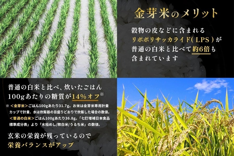 本商品は「金芽米無洗米ひのひかり」です。 金芽米(きんめまい)とは? 胚芽の舌触りの良くない部分を除き、基底部だけを残したお米です。 そして本商品は、お米の栄養と旨み成分が多く含まれる「亜糊粉層」(あこふんそう)も残しています。 厳選した玄米の表面から少しずつヌカ層を取り除き、金芽と亜糊粉層を残しているので甘みやコクがあり、 玄米の栄養も残されています。 金芽米の健康特性 @穀物の皮や胚芽に多く含まれる「リポポリサッカライド(LPS)」が、普通の白米と比べて約6倍も含まれています! A炊いたごはん100gあたりのカロリーが普通の白米と比べて17%、糖質が14%オフ! B玄米の栄養が残っているので、家族みんなの栄養バランスがアップ! ※金芽米は東洋ライス鰍フ登録商標です。 ※本商品をご購入の方に専用計量カップを1個おつけします。