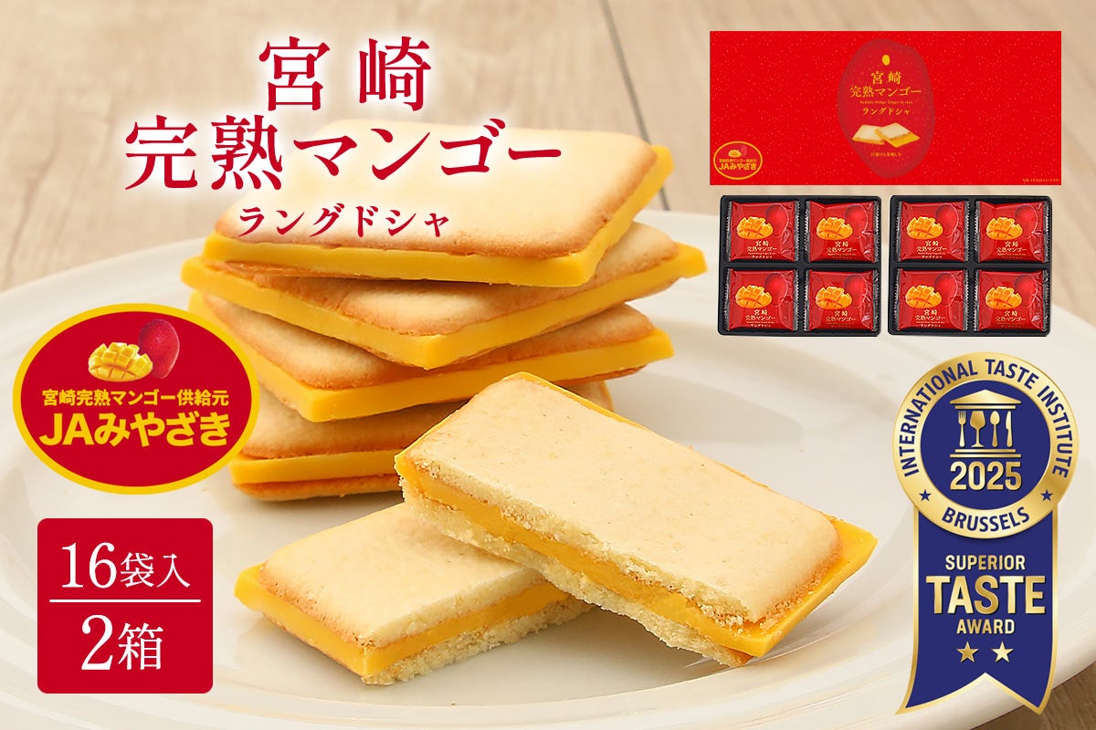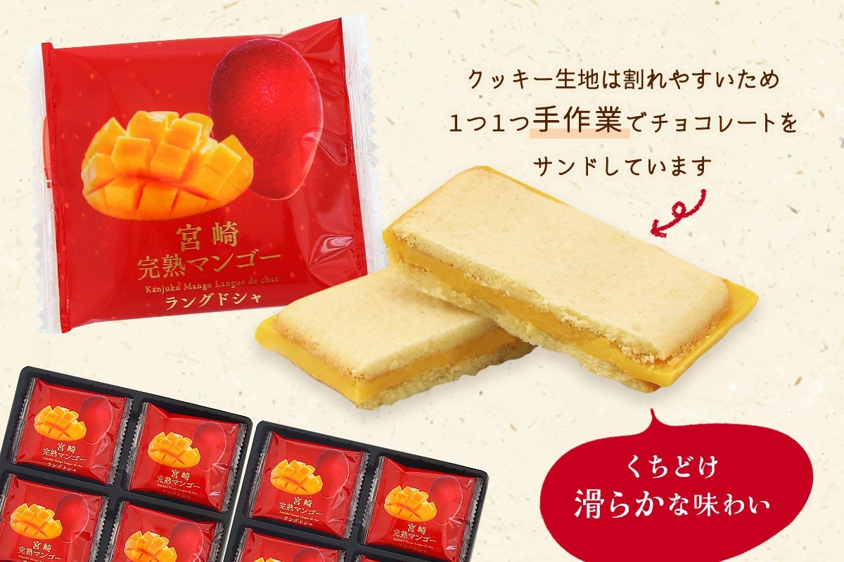 宮崎完熟マンゴーラングドシャ 16袋入×2箱 宮崎県産の完熟マンゴーパウダーと宮崎県産の牛乳を使用したラングドシャです。 封を開けた瞬間からふわっと香るマンゴー風味のチョコレートを、ミルク風味の生地で挟みました。 ちょっとした手土産にも自分用のご褒美にもオススメです。 ・宮崎完熟マンゴーとは 宮崎マンゴーは昭和60年から栽培が始まり、アップルマンゴーの中でも人気の高いアーウィン種(熟すと表皮が赤く色づく種類)です。 日照時間が長い宮崎県の太陽の下で、一つ一つ手間暇をかけて作られています。 樹上で熟し自然に落下した果実をネット袋でキャッチし、収穫したものを完熟マンゴーといいます。 ・クッキー生地について クッキー生地は割れやすいため、1つ1つ手作業でチョコレートを挟んでおります。 くちどけ滑らかな味わいをお楽しみください。