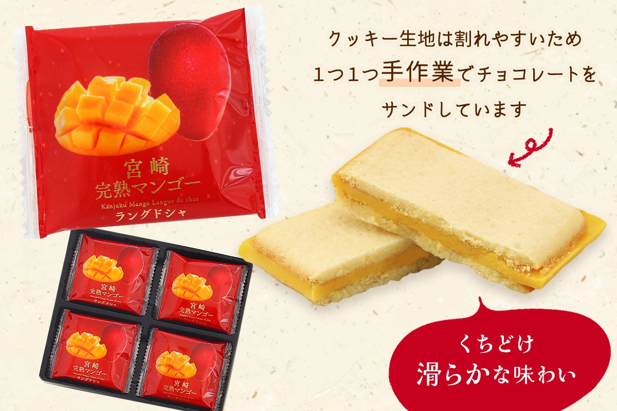 宮崎完熟マンゴーラングドシャ 8袋入×2箱 宮崎県産の完熟マンゴーパウダーと宮崎県産の牛乳を使用したラングドシャです。 封を開けた瞬間からふわっと香るマンゴー風味のチョコレートを、ミルク風味の生地で挟みました。 ちょっとした手土産にも自分用のご褒美にもオススメです。 ・宮崎完熟マンゴーとは 宮崎マンゴーは昭和60年から栽培が始まり、アップルマンゴーの中でも人気の高いアーウィン種(熟すと表皮が赤く色づく種類)です。 日照時間が長い宮崎県の太陽の下で、一つ一つ手間暇をかけて作られています。 樹上で熟し自然に落下した果実をネット袋でキャッチし、収穫したものを完熟マンゴーといいます。 ・クッキー生地について クッキー生地は割れやすいため、1つ1つ手作業でチョコレートを挟んでおります。 くちどけ滑らかな味わいをお楽しみください。