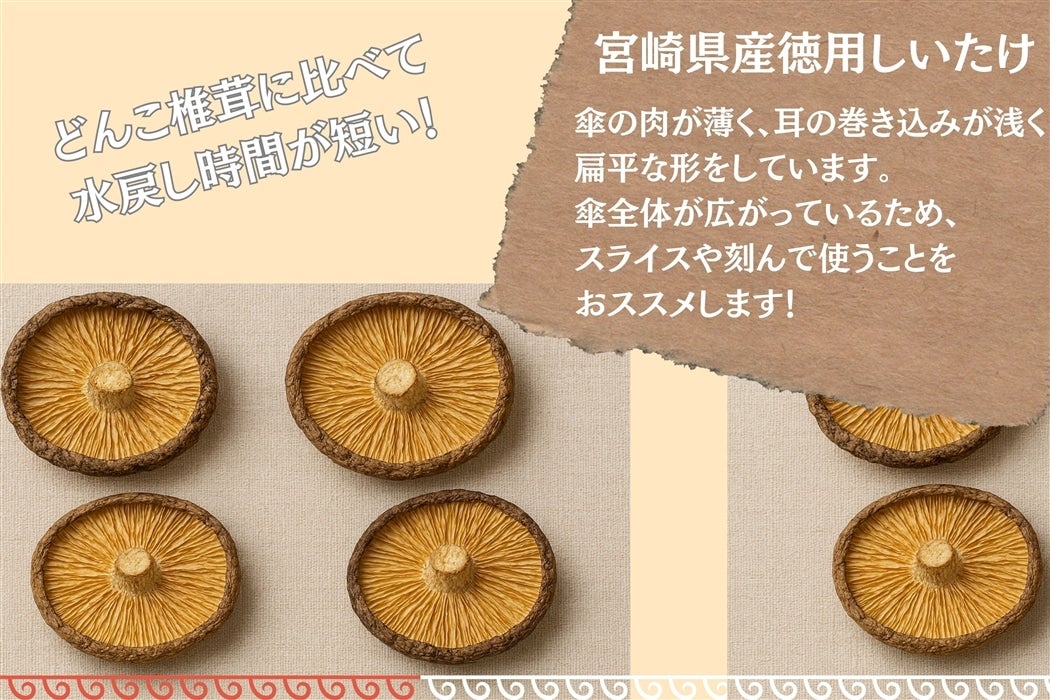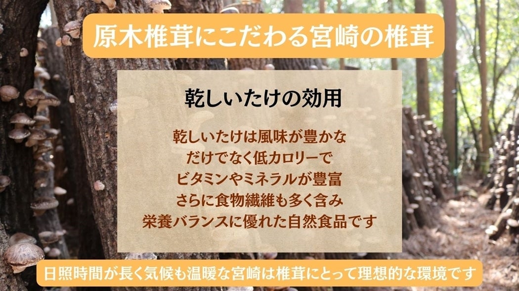 〈乾しいたけの効用♪〉 乾しいたけは風味があるばかりでなく、 低カロリー、高ビタミン、高ミネラルで、食物繊維に富み、自然の健康がバランス良く詰まっています。 お子様からお年寄りまで、安心してご利用できる、栄養価の高い健康食品です。 ※賞味期限…製造日より1年以内 ※原材料…原木しいたけ ※保存方法…直射日光を避け、湿度の低い所で保存して下さい。