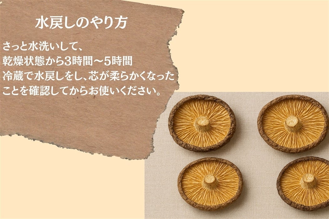 〈乾しいたけの効用♪〉 乾しいたけは風味があるばかりでなく、 低カロリー、高ビタミン、高ミネラルで、食物繊維に富み、自然の健康がバランス良く詰まっています。 お子様からお年寄りまで、安心してご利用できる、栄養価の高い健康食品です。 ※賞味期限…製造日より1年以内 ※原材料…原木しいたけ ※保存方法…直射日光を避け、湿度の低い所で保存して下さい。