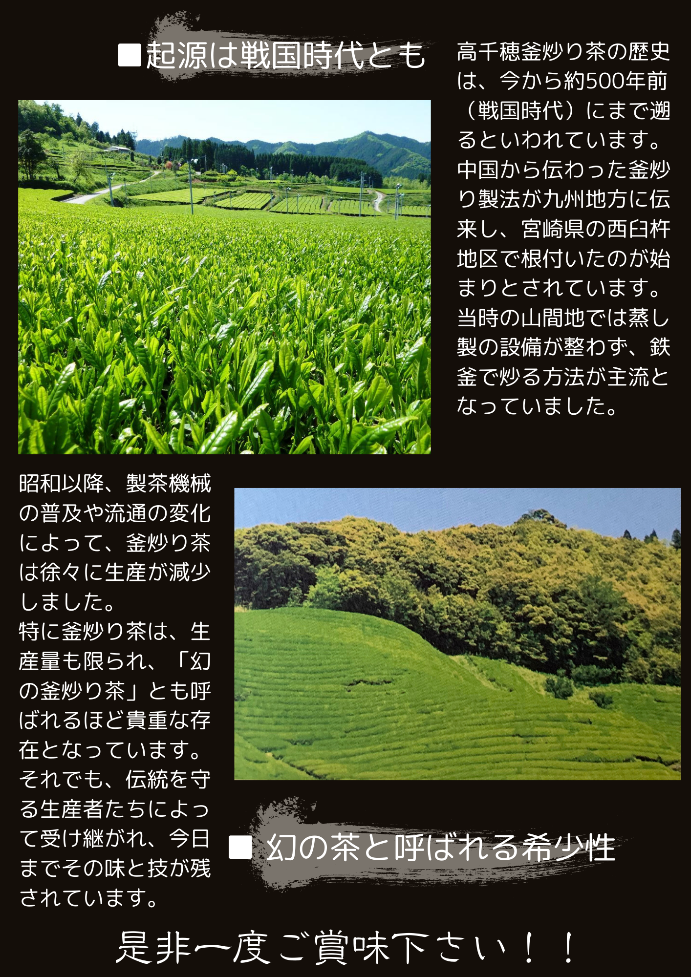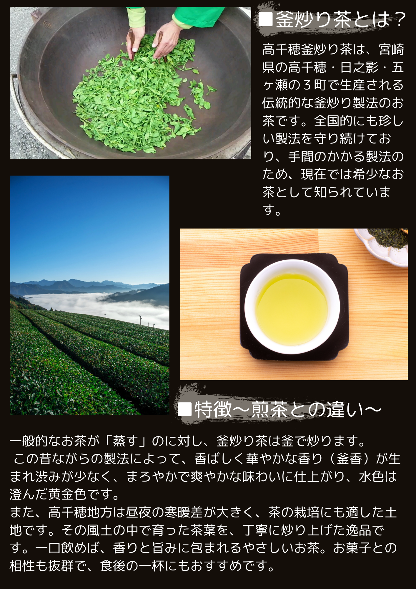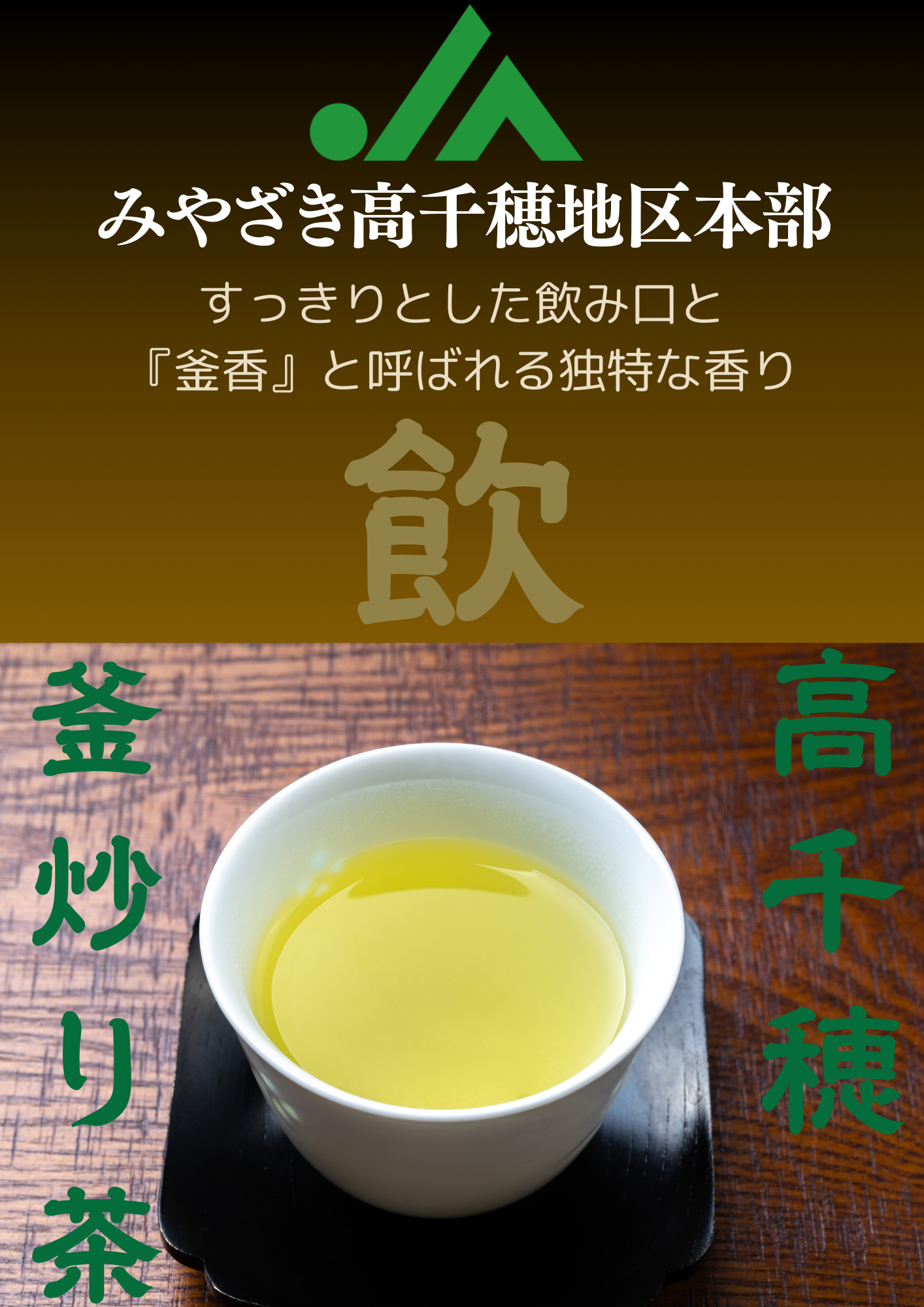 釜炒り茶『和』 「高千穂釜炒り茶『和』(なごみ)」の銘柄で親しまれています。釜炒り茶『極』に次ぐ商品ですが、 香り、外観、味。どれをとっても一級品で『極』に勝るとも劣らない商品です。
