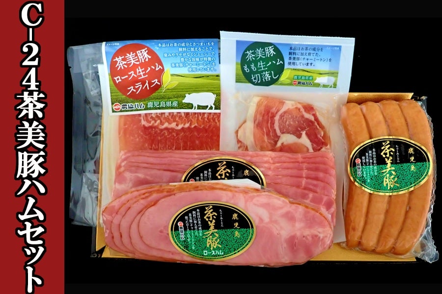 鹿児島県産の茶美豚を使用したハム、ベーコン、生ハム、ウインナーの詰合せセットです。 Q.茶美豚とは? A.緑茶粉末とお茶に含まれている成分「カテキン」と「さつまいも」が入った飼料を食べて育った豚が「茶美豚」です。 カテキンの効用である高酸化作用や消臭作用により、肉の鮮度を保ち、臭みの少ない豚肉です。 ・鹿児島県産 茶美豚ハムセット C-24 【内容量】茶美豚ロースハム 95g、茶美豚ベーコン 95g、茶美豚ロース生ハム 100g、茶美豚生ハム切り落とし 80g、茶美豚ウインナー 150g 【賞味期限】冷蔵で30日 【アレルギー】小麦、卵、乳 【配送方法】クール便(冷蔵)