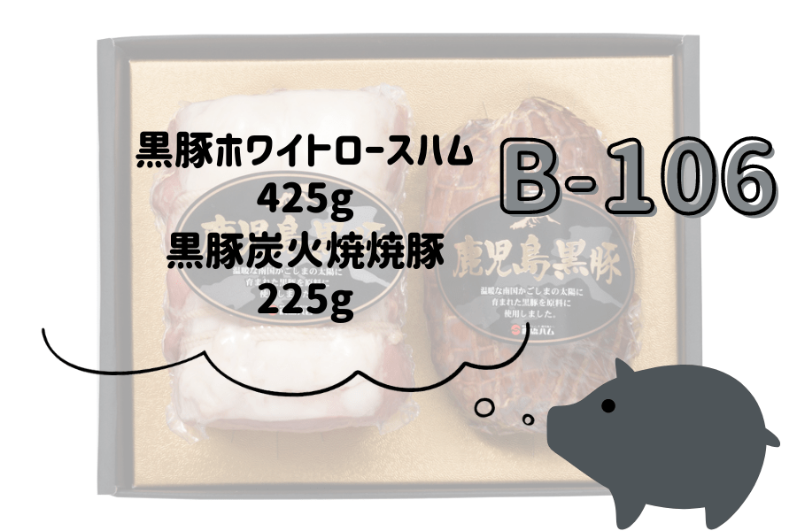鹿児島県産黒豚を使用したハムのバラエティセットです。 鹿児島黒豚のおいしさが詰め込まれた人気の商品です。 ・鹿児島県産 黒豚ハムセット B-106 【内容量】黒豚ホワイトロースハム 425g、黒豚炭火焼焼豚 225g 【賞味期限】冷蔵で40日 【アレルギー】小麦、乳 【配送方法】クール便(冷蔵)