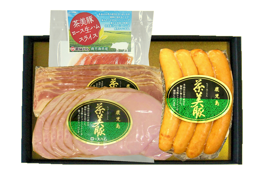 鹿児島県産の茶美豚を使用したハムのバラエティセットです。 Q.茶美豚とは? A.緑茶粉末とお茶に含まれている成分「カテキン」と「さつまいも」が入った飼料を食べて育った豚が「茶美豚」です。 カテキンの効用である高酸化作用や消臭作用により、肉の鮮度を保ち、臭みの少ない豚肉です。 ・鹿児島県産 茶美豚ハムセット C-31 【内容量】茶美豚ロースハム 95g・茶美豚ベーコン 95g、茶美豚ロース生ハム 100g、茶美豚ウインナー 150g 【賞味期限】冷蔵で30日 【アレルギー】小麦、卵、乳 【配送方法】クール便(冷蔵)