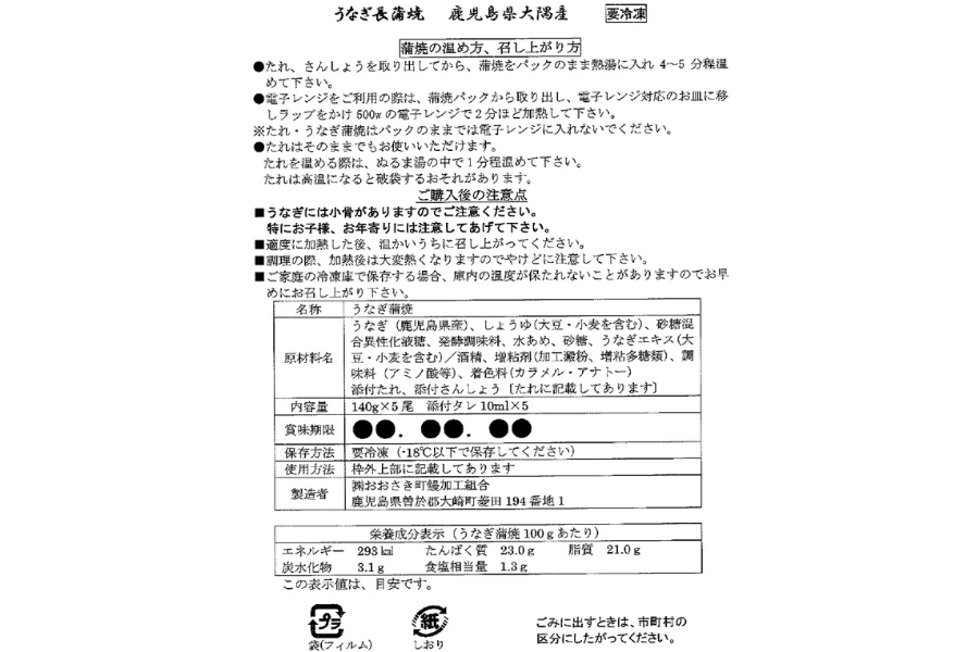 2020年日本ギフト大賞【鹿児島賞】受賞しました! 日本一のうなぎの生産量を誇る鹿児島県大隅半島(大崎町)で、温暖な気候と清涼な地下水で稚魚から育てられた活うなぎを使用し、無着色の甘いたれで焼き上げた美味しい蒲焼です。 【内容量】 ・鹿児島県産うなぎ蒲焼(約28cm)140g×5尾入 ・たれ・さんしょう付 【賞味期限】製造日より冷凍で90日 【アレルギー】小麦 【配送方法】冷凍 【原材料】 〇うなぎ蒲焼:うなぎ(鹿児島県)、しょうゆ(大豆・小麦を含む)、 砂糖混合異性化液糖、発酵調味料、水あめ、砂糖、うなぎエキス(大豆・小麦を含む) /酒精、増粘剤(加工澱粉、増粘多糖類)、調味料(アミノ酸等)、着色料(カラメル、アナト―)】 〇添付タレ :【しょうゆ(小麦・大豆を含む、国内製造)、砂糖、醗酵調味料、水飴/カラメル色素、 調味料(アミノ酸等、V.B1)】、さんしょう