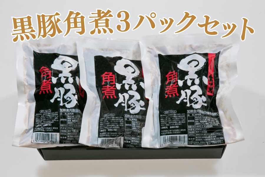 黒豚バラ肉に加工黒糖と鹿児島の焼酎、本醸造醤油で味付けしたタレと合わせて加圧加熱殺菌した美味しく安心な角煮です♪ 加圧加熱殺菌することで柔らかく仕上がっています。 【商品内容】黒豚角煮3パックセット ・黒豚角煮250g×3P 【アレルギー】小麦・豚肉・大豆 【賞味期限】製造日より120日 【配送方法】常温