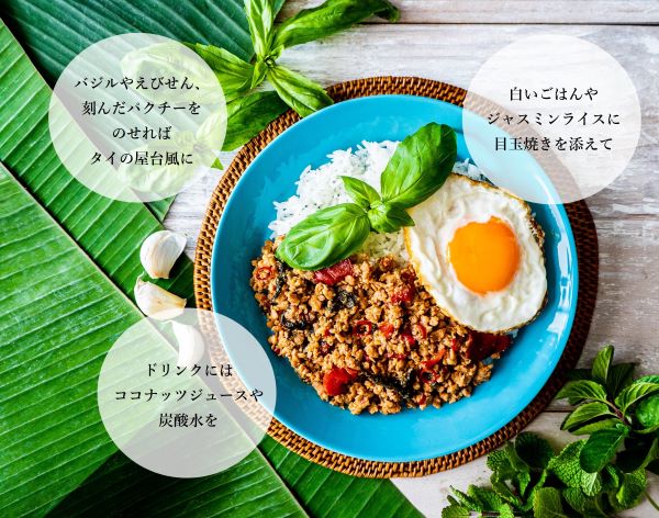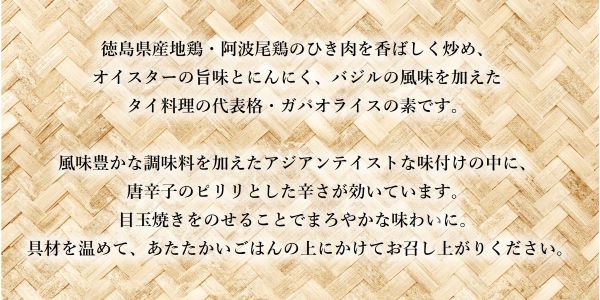 鶏肉(徳島県産)、グリルピーマン、オイスターエキス、粒状大豆たん白、食物油脂、バジル、にんにく加工品、魚醤(魚介類)、砂糖、チキン調味エキス、でん粉、唐辛子/調味料(アミノ酸等)、(一部に小麦・大豆・鶏肉・豚肉・ゼラチン・魚醤(魚介類)を含む)