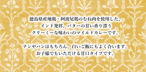 鶏肉(徳島県産)、ソテーオニオン、トマトペースト、生クリーム、砂糖、ココナッツミルクパウダー、野菜(生姜、にんにく)、チキンエキス、小麦粉、バター、アーモンドパウダー、香辛料、食塩、澱粉/カラネル色素、(一部に小麦・乳成分・アーモンド・大豆・鶏肉・豚肉を含む)