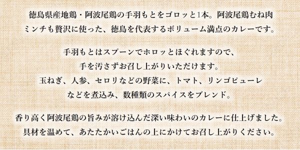 鶏肉(手羽元骨付肉(徳島県産)、むね肉(徳島県産))野菜(玉葱、人参、セロリ、生姜)、カレールウ、固形トマト、ココナッツミルク、リンゴピューレ、はちみつ、チキン調味パウダー、ピーナッツペースト、チャツネ、乳類を主原料とする食品、チョコレートパウダー、香辛料、おろしにんにく加工品、りんご果汁/調味料(アミノ酸等)、着色料(カラメル)、酸味料、香料、(一部に小麦・卵・乳成分・落花生・大豆・鶏肉・りんごを含む)