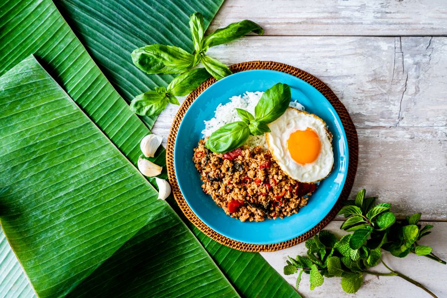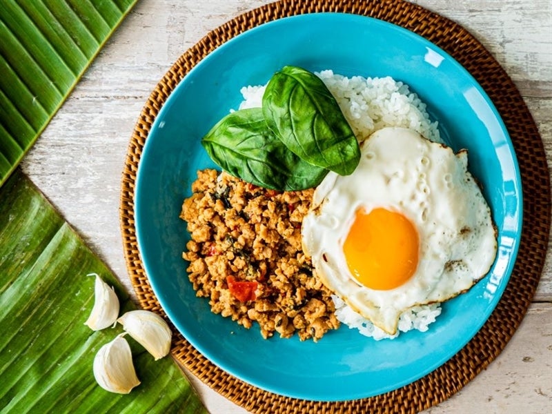 ごはんやジャスミンライスに目玉焼きを添えて、ドリンクにはココナッツジュースや炭酸水を。えびせんやきざんだパクチーをのせればタイの屋台風になります。
