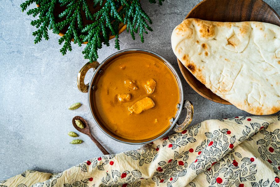 ごはんはもちろん、ナンやパスマティライスと一緒に、ドリンクにはラッシーやチャイを。野菜や茹でたお豆をカレー粉やコンソメで和えたエスニックサラダを添えると豪華です。