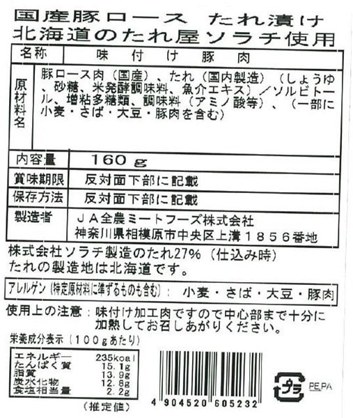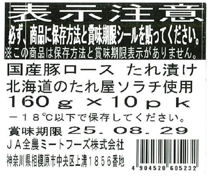 国産豚ロースたれ漬け 北海道のたれ屋 ソラチ使用 160g×10パック入り