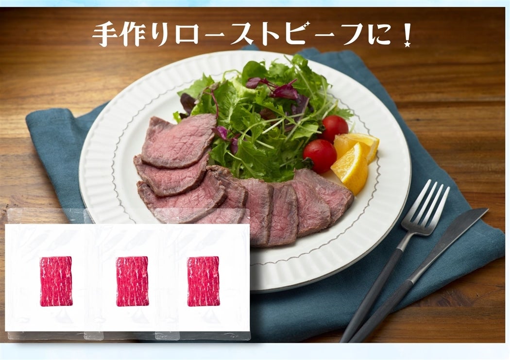 脂身が少なくヘルシーで、しっとり柔らかく仕上がるためローストビーフに最適。煮込み・ステーキ・たたきなど幅広い料理にも活用できます。3パック入りで必要な分だけ解凍でき、家庭でもプロのような仕上がりを楽しめる万能ブロック肉です。