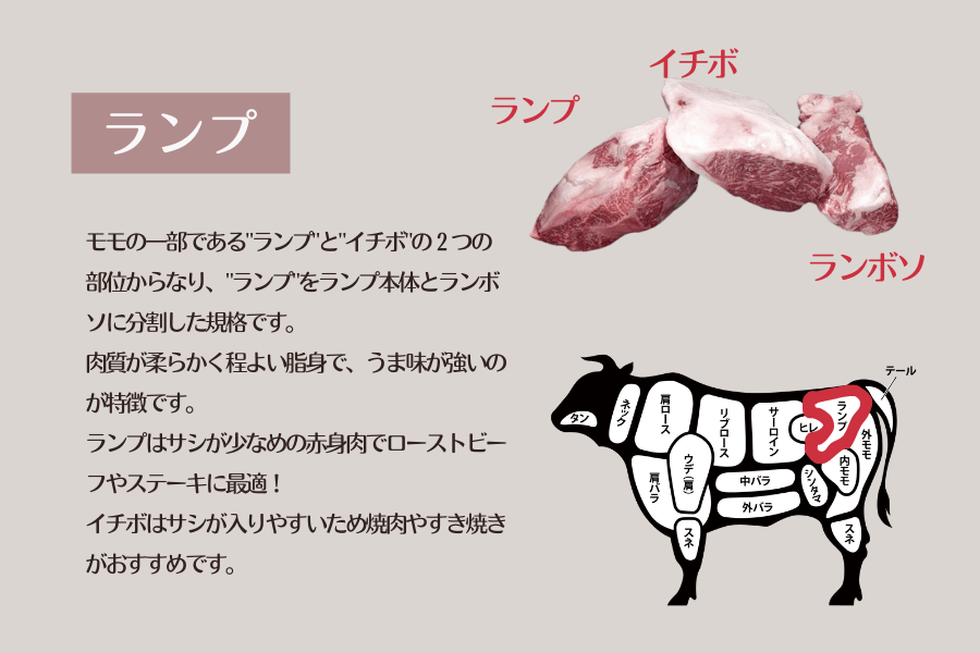 ランプとはモモの一部である「ランプ」と「イチボ」の2つの部位からなります。